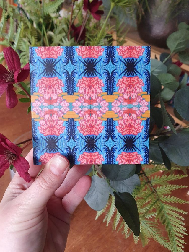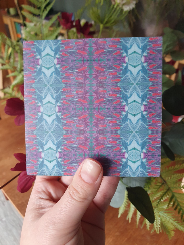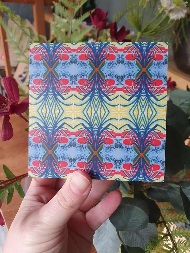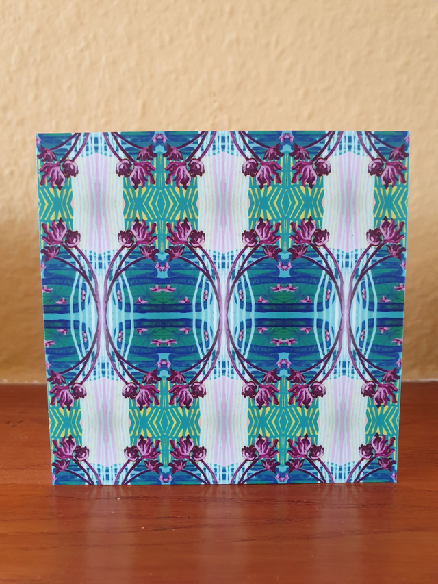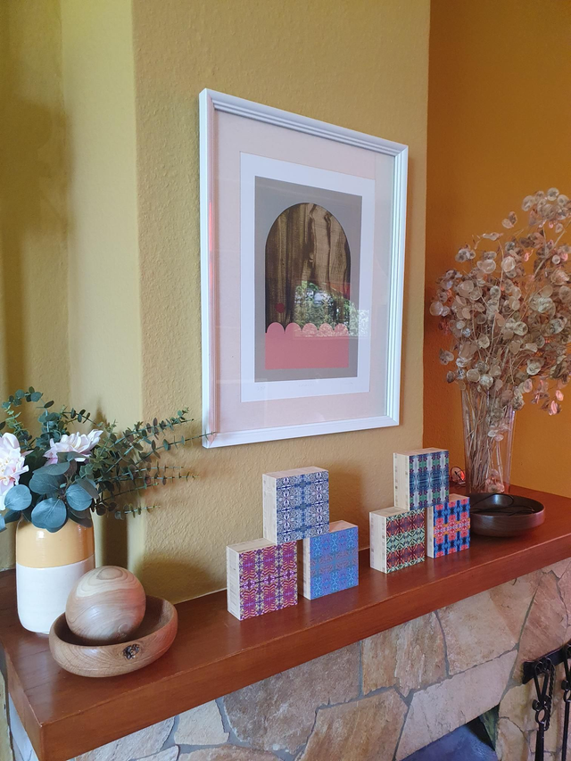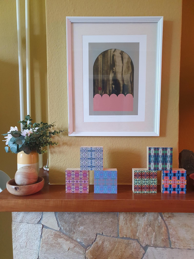 Bamboo pattern blocks (10 x 10 x 4 cm) with painting inspired mirrored pattern tiles on one side. You can place them anywhere you like, even build mosaics with them placing them next to or on top of each other. They're colourful, beautiful, affordable, rearrangeable and (very important to me!) they do not serve any other purpose than just being ridiculously beautiful while radiating pure joy.