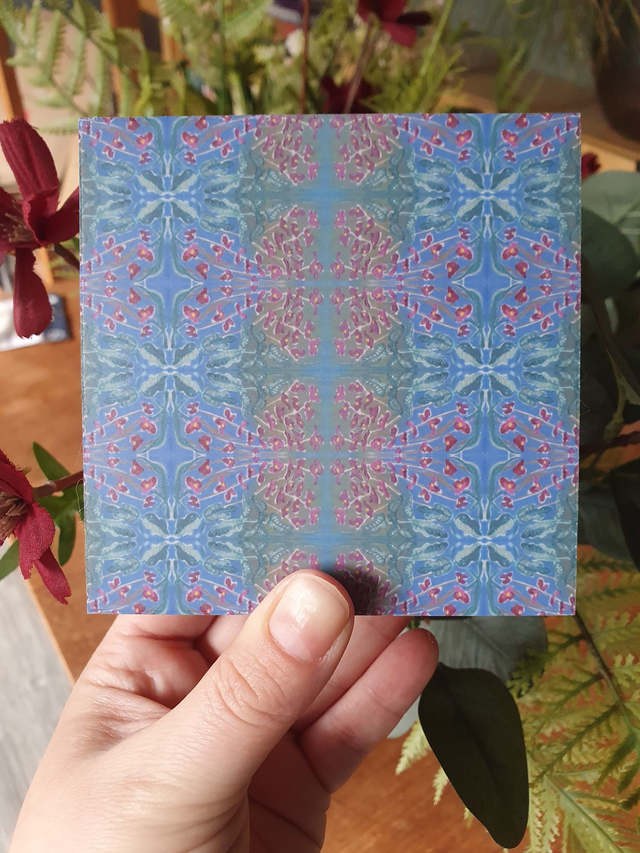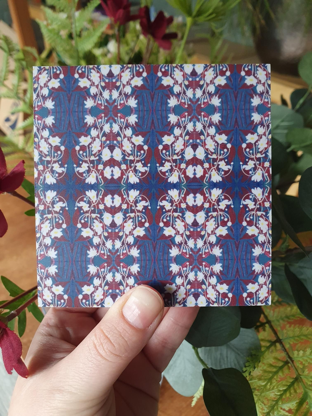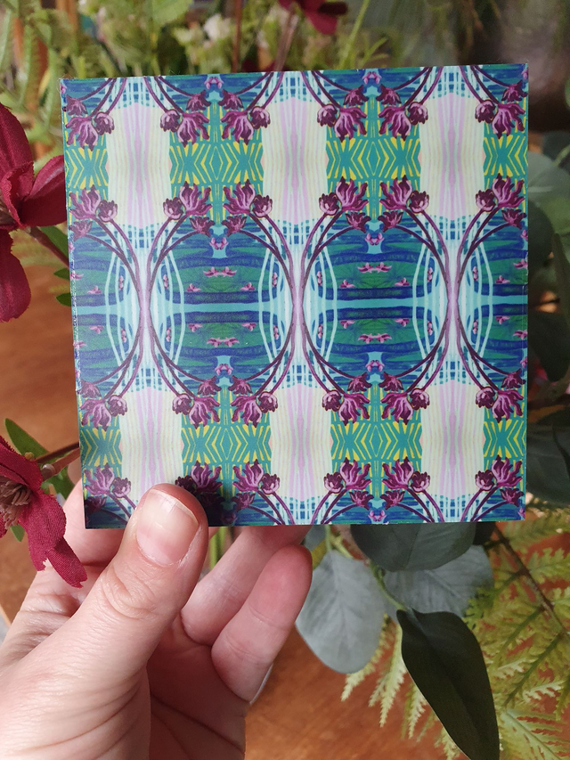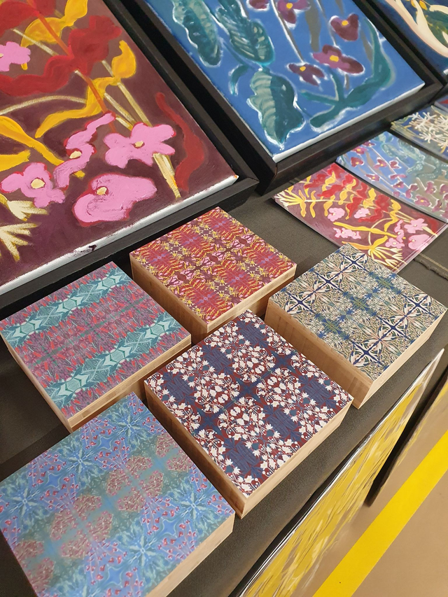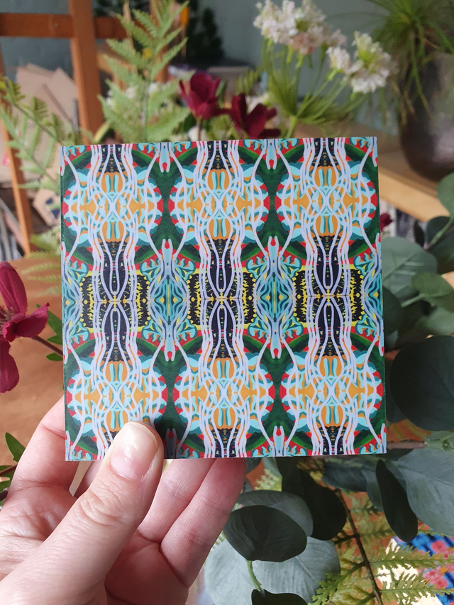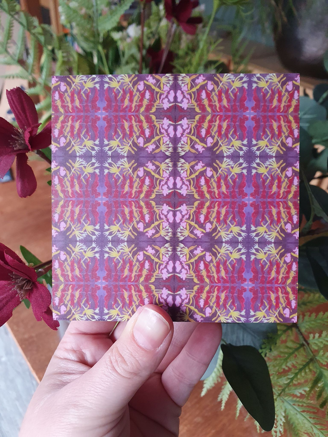 Bamboe patroonblokken (10 x 10 x 4 cm) eenzijdig beprint met gespiegelde kunstpatronen. Je kunt ze overal neerzetten waar je wilt en er zelfs mozaïeken mee bouwen door ze naast of op elkaar te zetten. Ze zijn kleurrijk, prachtig, betaalbaar, makkelijk te verplaatsen en (voor mij het belangrijkst) decoratief in de puurste, vrolijkste zin van het woord. Een genot om naar te kijken.