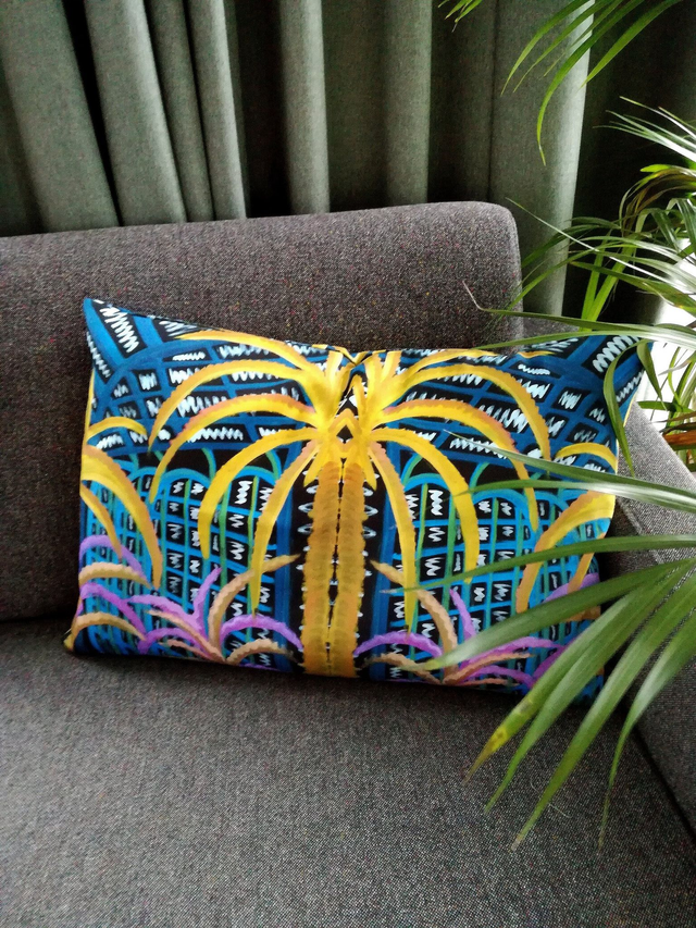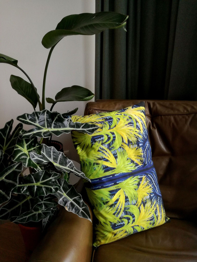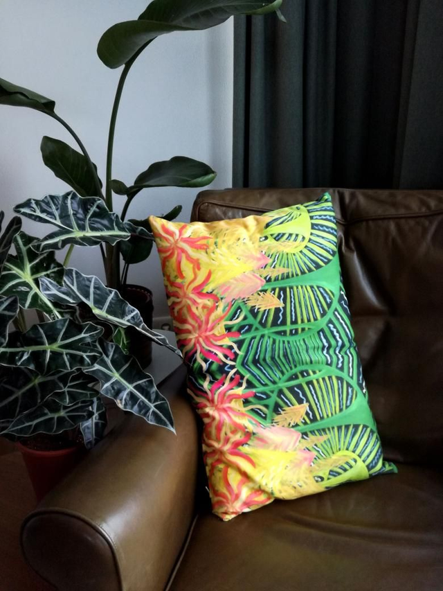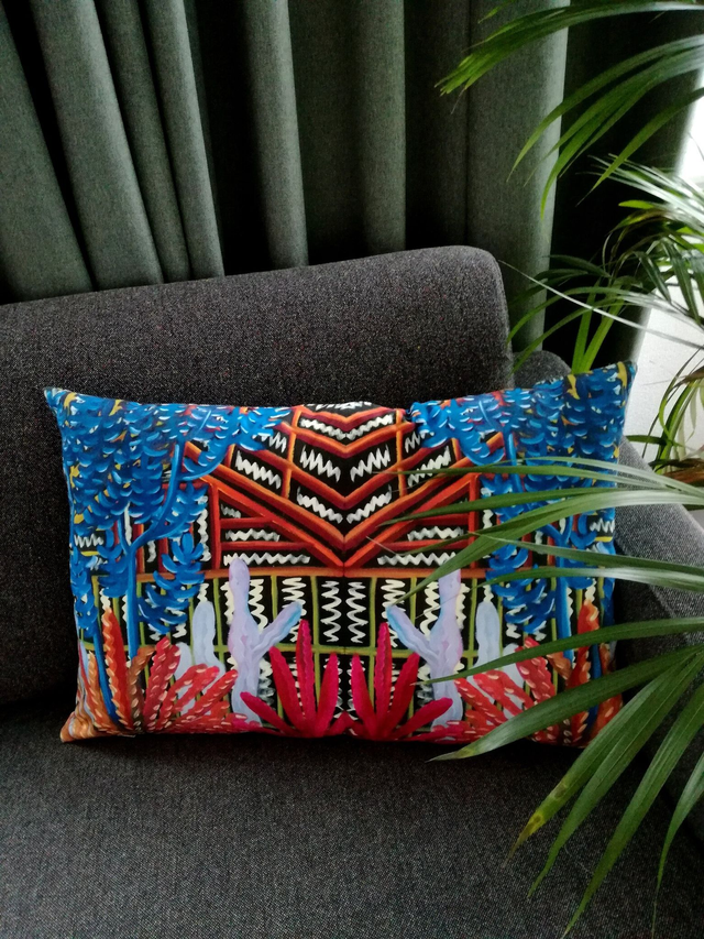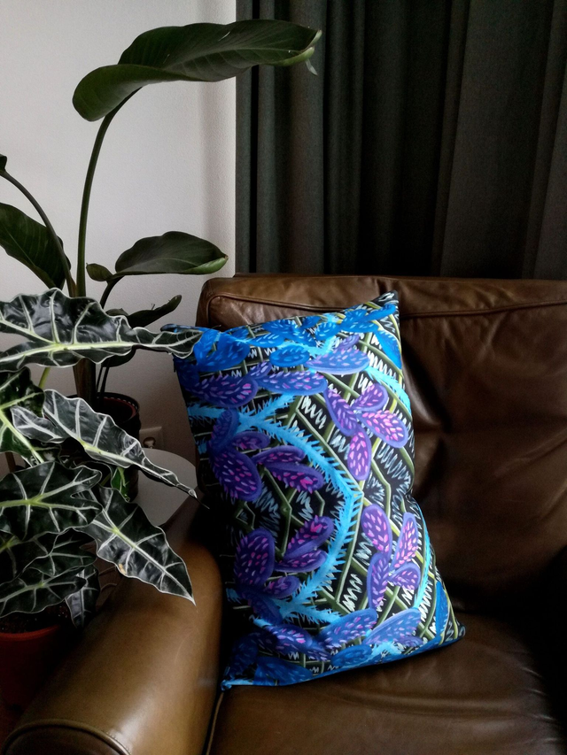 Soft satin cotton cushion covers printed with colourful mirrored art patterns, based on my Hortus by Night oil paintings.