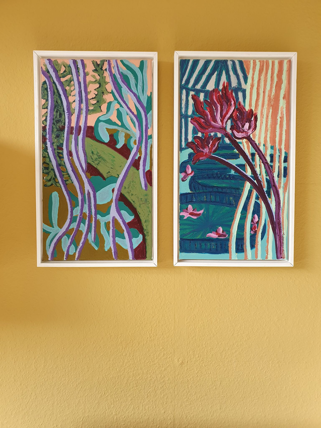 "Jungle Dreams" original oil + oil pastel paintings on canvas (2025), 30 x 55 cm, in white wooden box frame, ready to hang. Price per painting.