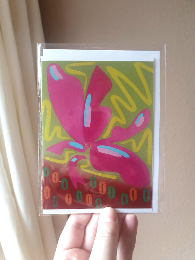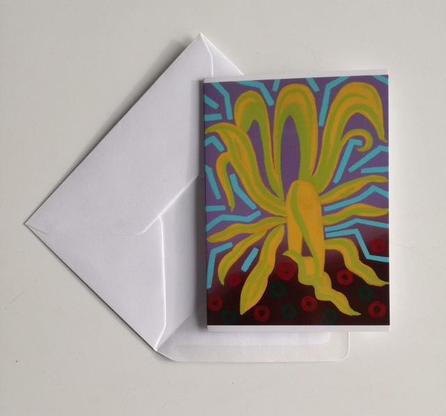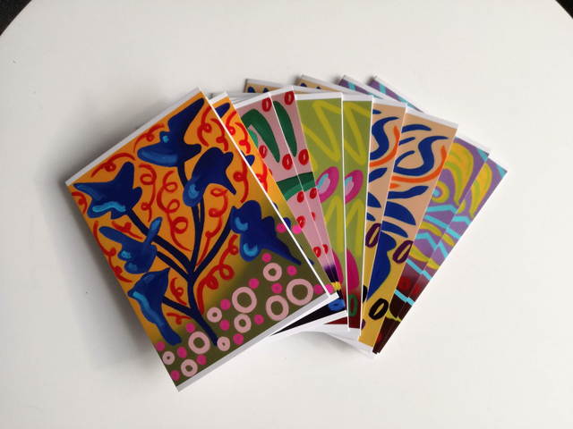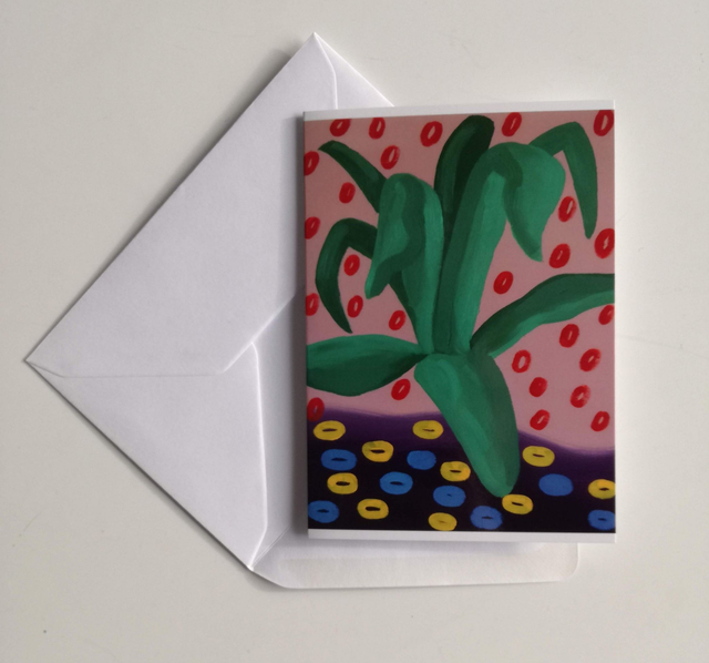 Wenskaarten (A6) met digitale reproducties van mijn vijf Majorelle olieverfschilderijen: Blauwe Varen, Gele Agave, Groene Cactus, Blauwe Olifantsoor en Roze Banaan. €3,50 per stuk, of koop een setje kaarten: de hele set van 5 kaarten voor €10,- of een set van 2 x 5 kaarten voor €20,- (elke set is verpakt in een bruine craft envelop met Japanse sluiting).