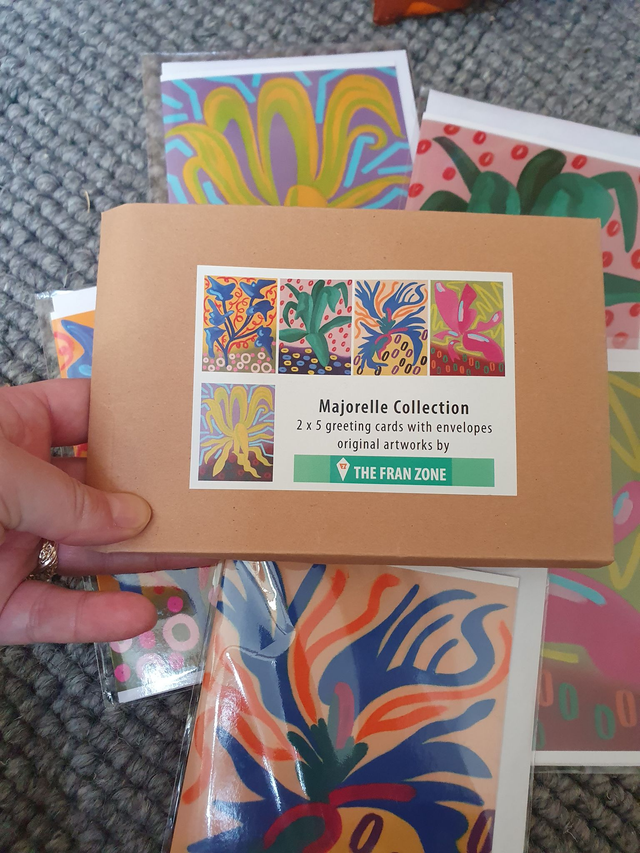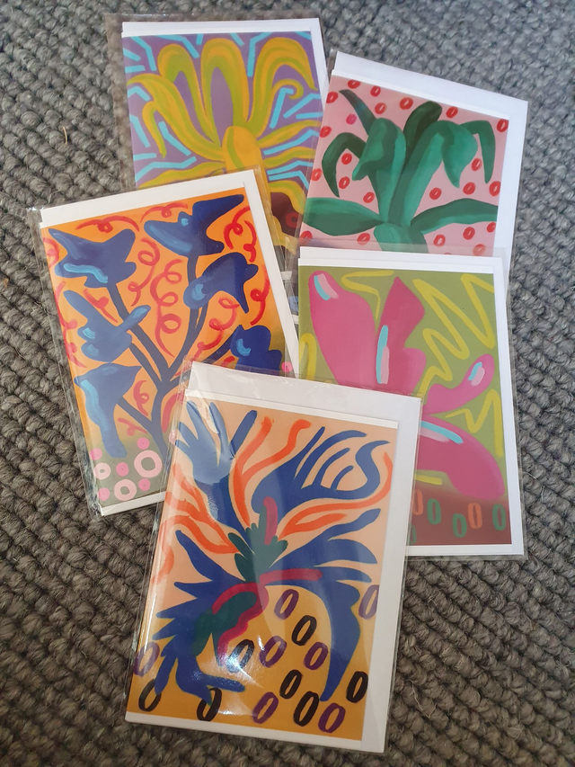 Majorelle greeting cards sets with all 5 cards, envelopes included. Sets come in a brown string and washer craft nevelope. Available as set of 5 greeting cards (1 x all 5 designs) or 10 greeting cards (2 x all 5 designs). Envelopes included. Cards are blank inside for your own message.