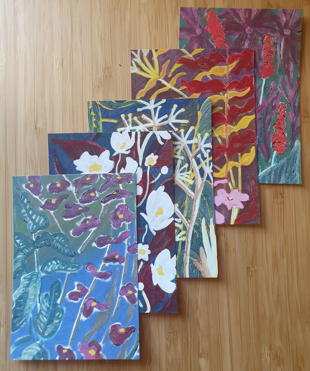 Ansichtkaarten (A6) met digitale reproducties van mijn vijf Nachttuin olieverfschilderijen. €2,- per stuk, of koop een setje kaarten: de hele set van 5 kaarten voor €7,50 of een set van 2 x 5 kaarten voor €10,- (elke set is verpakt in een craft envelop met Japanse sluiting). Blanco achterkant voor je eigen bericht.