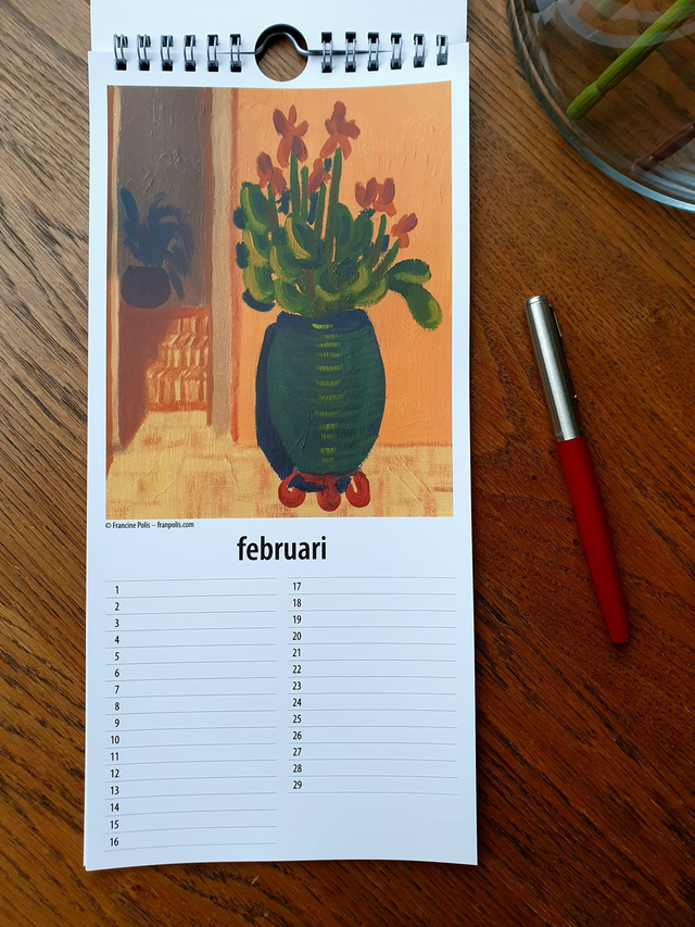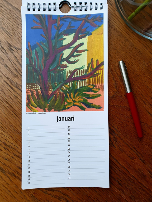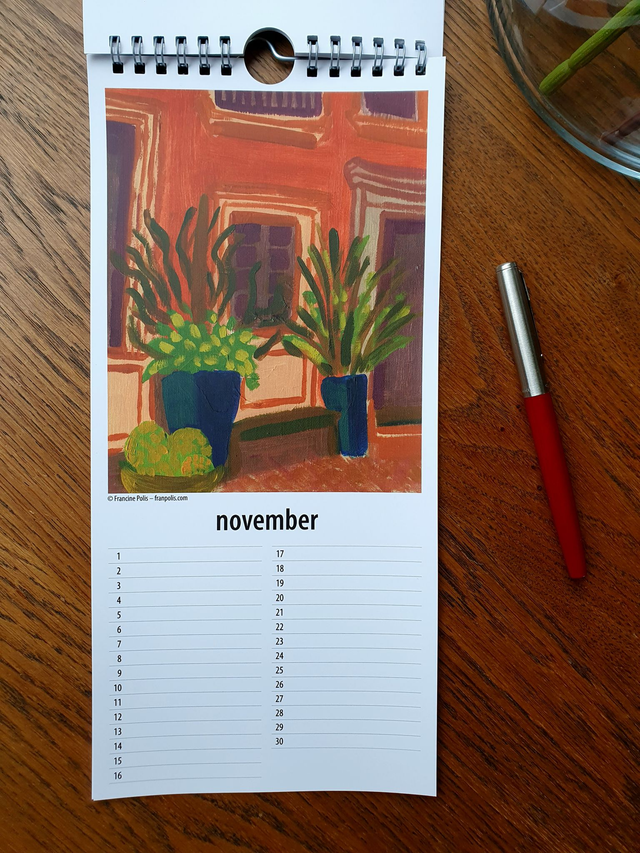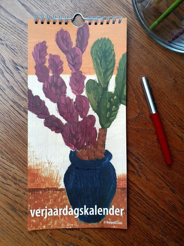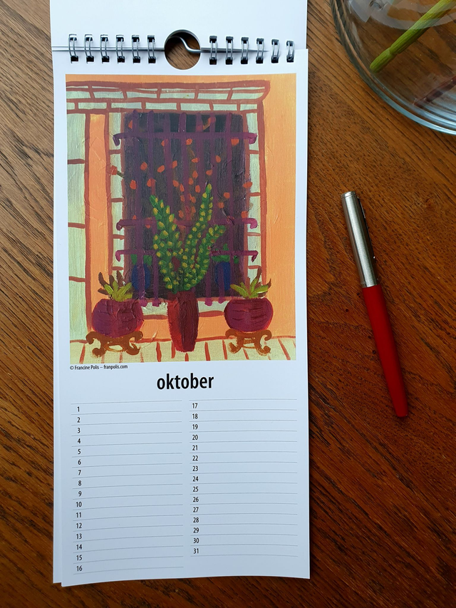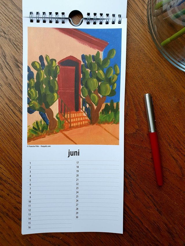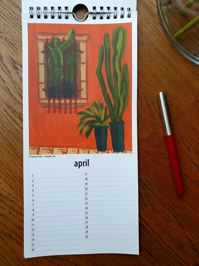 Urban Desert birthday calendar with 12 different digital reproductions of my oil paintings of cacti, succulents and desert city scenery. Wire-O bound. Size: 14 x 29.7 cm